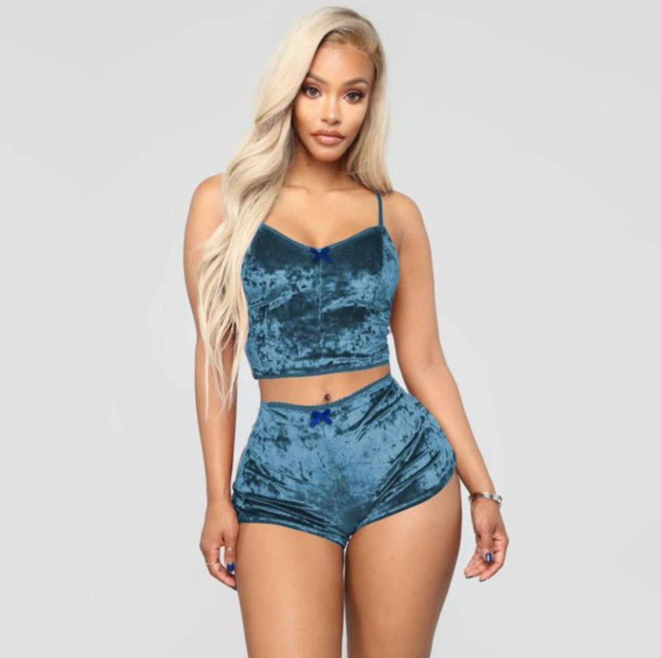 Our Two piece Velvet lingerie is soft to the touch & true to its size! With its sexy soft adjustable strap croptop and coochie cutter shorts, is guaranteed to make you the ultimate baddie in the bedroom that he won’t be able to keep he’s hands off of! ORDER NOW!!!!